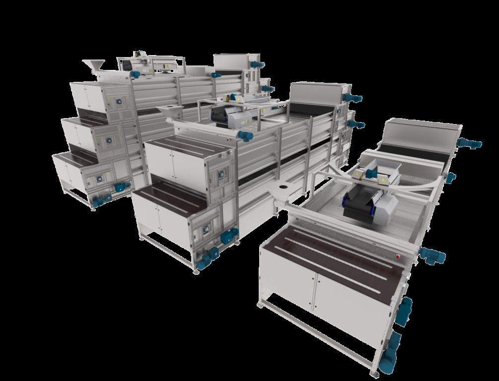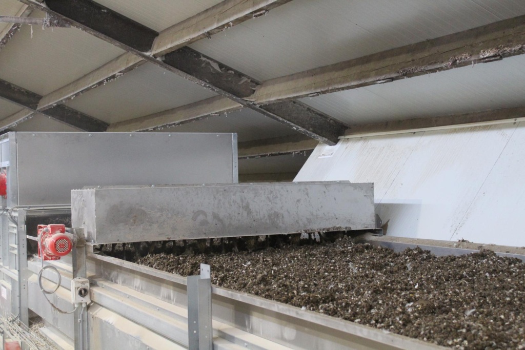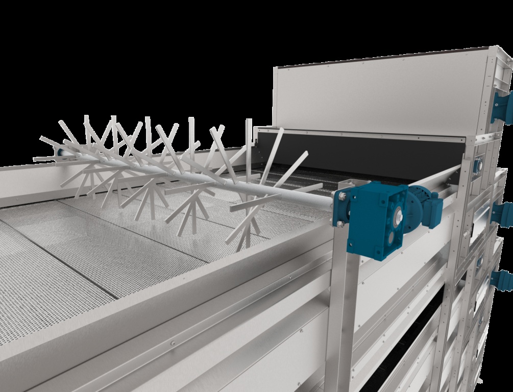 Das zu trocknende Material wird auf der obersten Etage mittels eines Schwenk‑ bzw. Verteilförderbands gleichmäßig verteilt. Sobald das Produkt das Ende des Tunnels erreicht, kippen die Platten, und das Material fällt automatisch auf die darunterliegende Etage. Das Produkt bewegt sich anschließend in die entgegengesetzte Richtung und wird weiter getrocknet. Stallluft oder erwärmte Außenluft wird durch die perforierten Platten und den Kot gepresst – mithilfe von Hochdruckventilatoren.