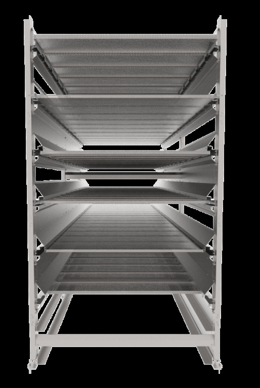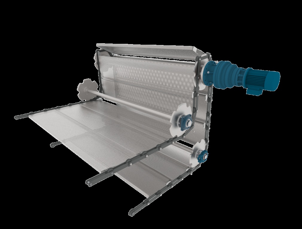 Der PoulDry Trockner besteht aus 2, 4 oder 6 Etagen und kann bis zu einer Länge von 50 Metern gebaut werden. Die hohe Industriequalität zeigt sich deutlich in den perforierten Edelstahlplatten, die mit einer industriellen Transportkette verbunden sind. Diese Kette wird von Motoren mit einem Planetenzahnradantrieb angetrieben.